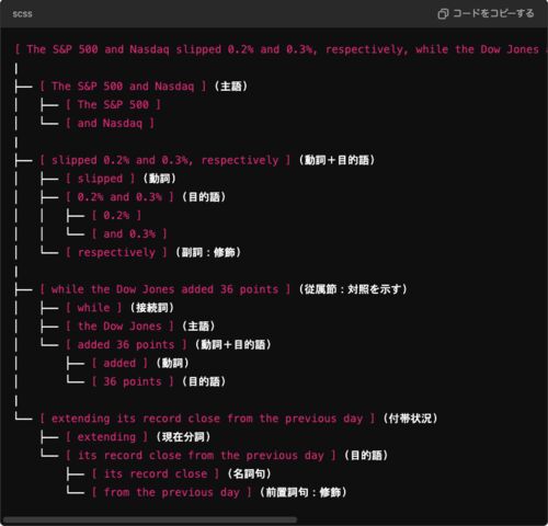 複雑で修飾関係が分かりにくい英文を構文木で表現してもらいました。しかし、出力スタイルが統一されません。そこで、サンプル画像を添付して指示したところ、狙い通りの構文木を得ることができました。